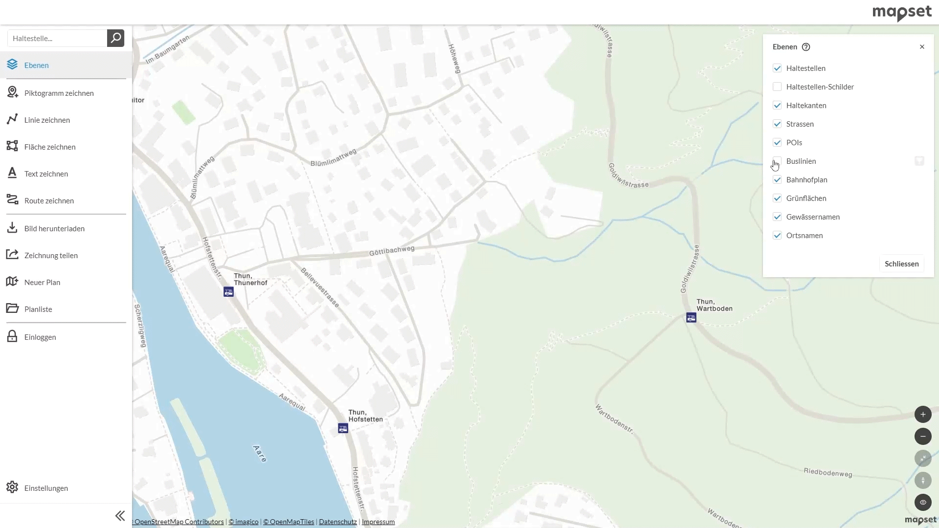 Falls Sie mapset noch nicht nutzen, probieren Sie am besten unsere Demo-Version unter mapset.ch aus. Mit ihr können Sie mapset und seine umfangreichen Funktionen unverbindlich testen. Auf der Homepage unter mapset.ch finden sie auch ein Video, das die einfache Bedienung von mapset und die Gestaltungsmöglichkeiten von Plänen zeigt.